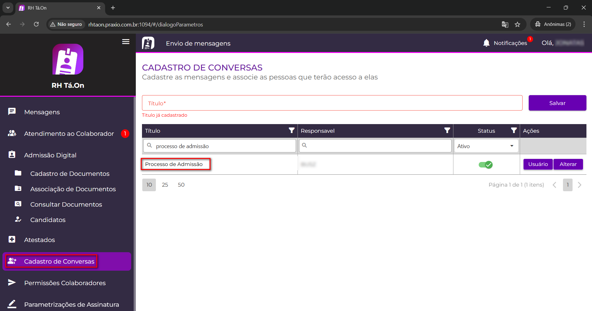 Foi implementada no RH Tá.On a tela de Cadastro de Conversas, com o função de cadastrar os Títulos da Mensagens para o diálogo entre a empresa e os funcionários.