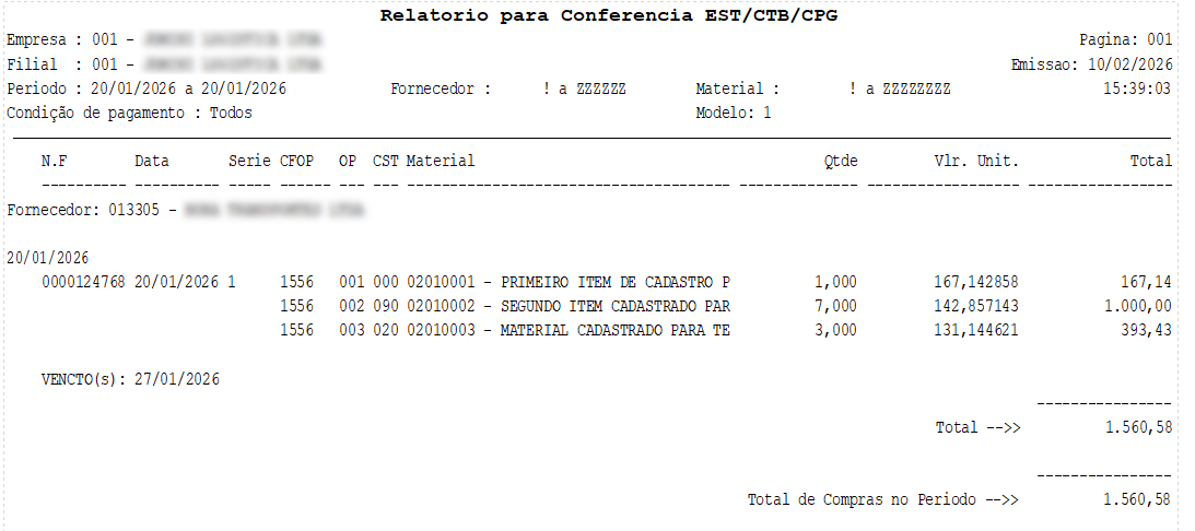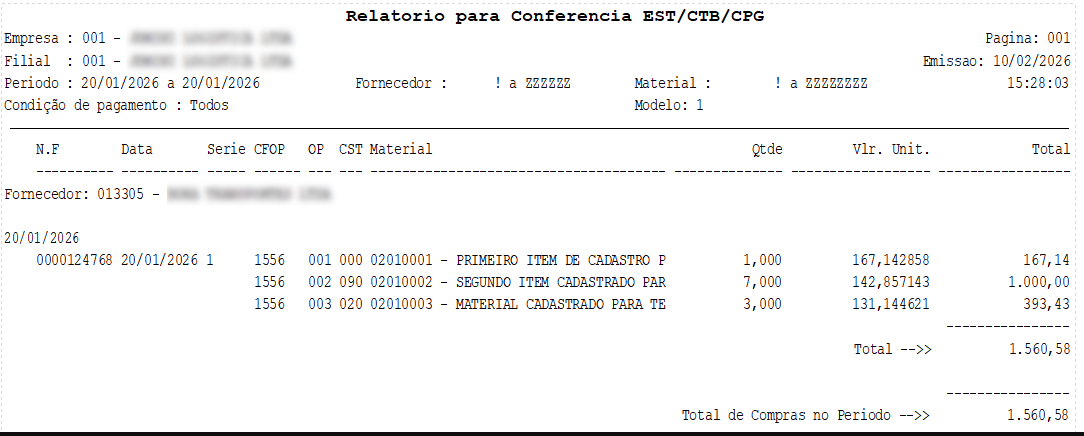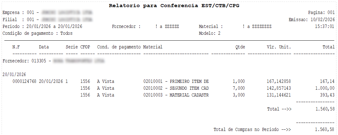 Modelo 2 - Nesse modelo são impressos: Código e descrição do fornecedor, número da nota fiscal, data de entrada, série, CFOP, condição de pagamento , código e descrição do material, quantidade, valor unitário e valor total .