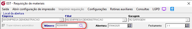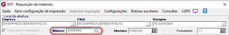 Com o parâmetro desmarcado, ao informar um número de requisição ainda não utilizado, será gerada a requisição com o número informado. Local padrão para requisição Objetivo: Nas rotinas de requisição, ao informar a empresa e filial, o local para movimentação é preeenchido automaticamente de acordo com o informado no parâmetro.