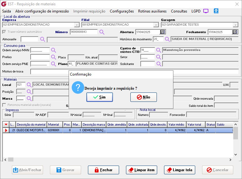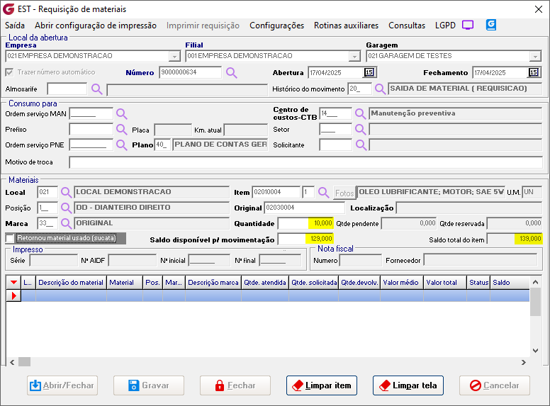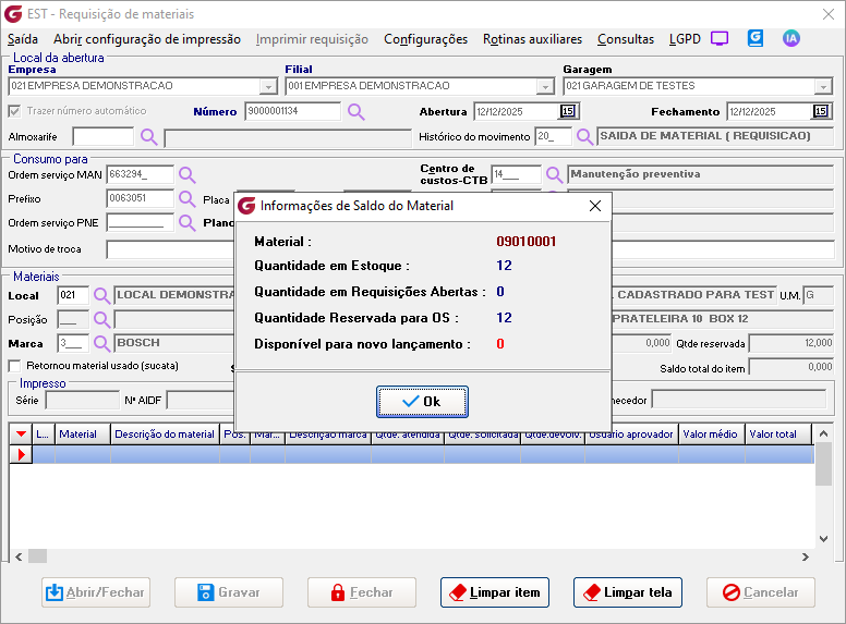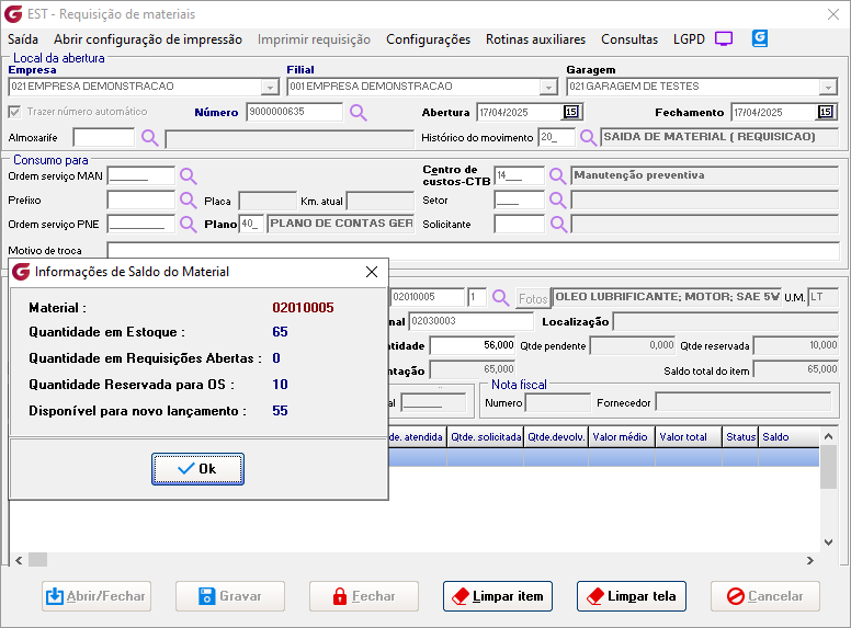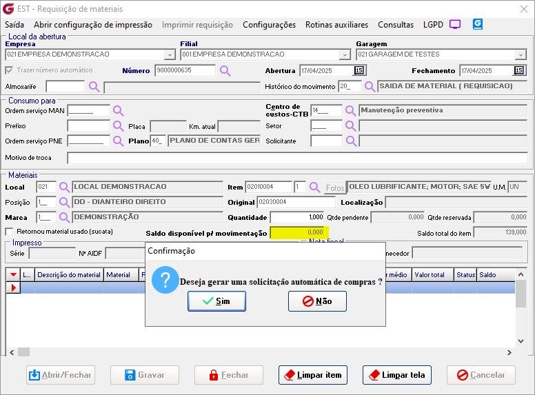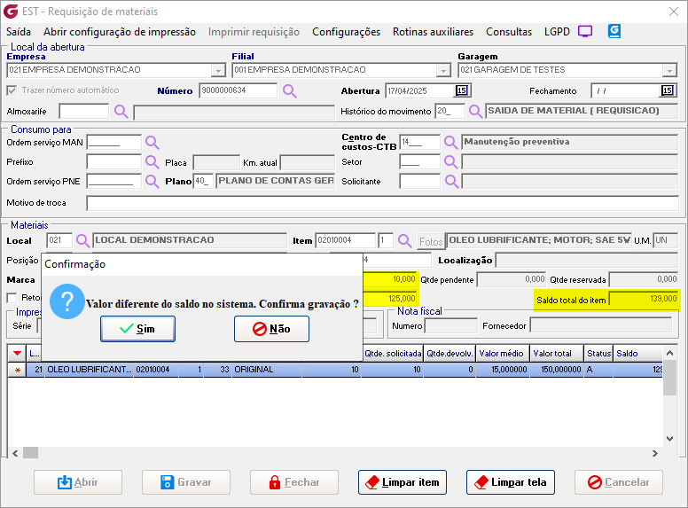 Baixar requisição no momento da abertura Objetivo: Definir se as rotinas de requisição de materiais sejam concluídas em uma ou mais etapas. Com o parâmetro marcado as rotinas de saída "Por requisição de materiais" , "Requisição de materiais por consulta de O.S." e "Requisição simplificada" são realizadas em uma etapa, na gravação da requisição os itens serão baixados do estoque. Com o parâmetro desmarcado as rotinas de saída "Por requisição de materiais" , "Requisição de materiais por consulta de O.S." e "Requisição simplificada" são realizadas em mais de uma etapa, de acordo com parâmetros definidos pelo usuário. Na rotina de requisição pelo app Estoque, as requisições são sempre em mais de uma etapa. Nas rotinas de requisição geradas pelos módulos de Componentes, Motor e Pneus as requisições serão sempre em uma única etapa. Digitar saldo no movimento de requisição Objetivo: Nas rotinas de saída "Por requisição de materiais" , "Requisição de materiais por consulta de O.S." e "Requisição simplificada" definir se deve ser informado o saldo do material. Com o parâmetro marcado, após digitar a quantidade requisitada deve ser informado o saldo do material, após a retirada, como no exemplo abaixo.![]() Caso a quantidade informada seja diferente do saldo no sistema, é apresentada mensagem informativa.