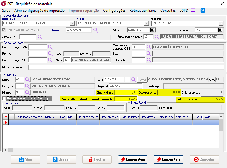 Quando houver quantidade pendente de saída, o saldo informado deve considerar a quantidade pendente, como no exemplo abaixo.