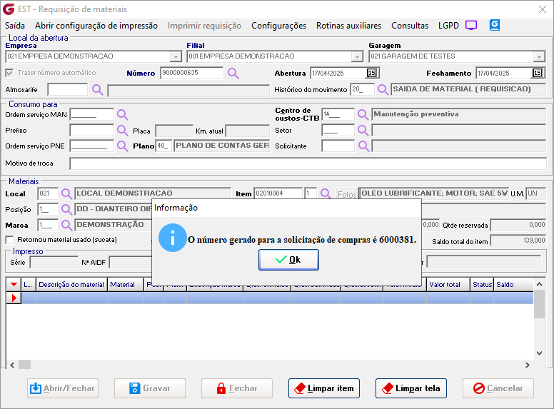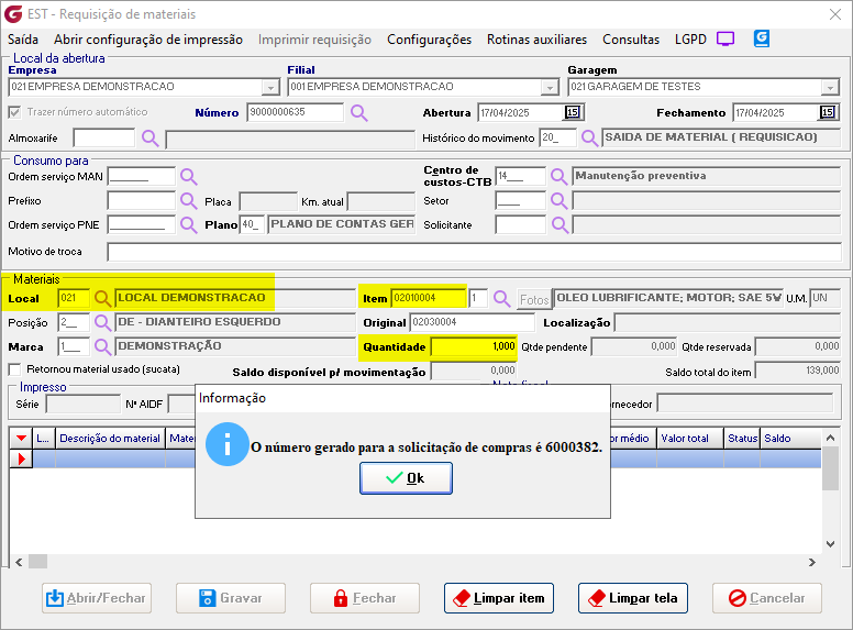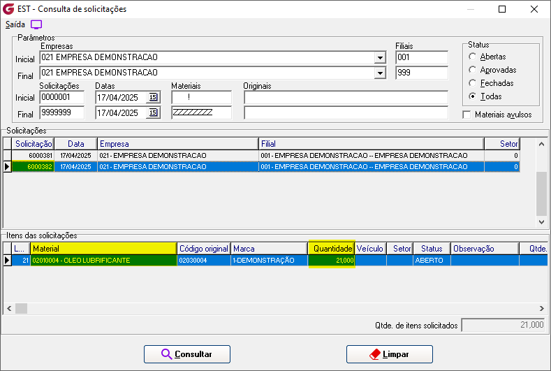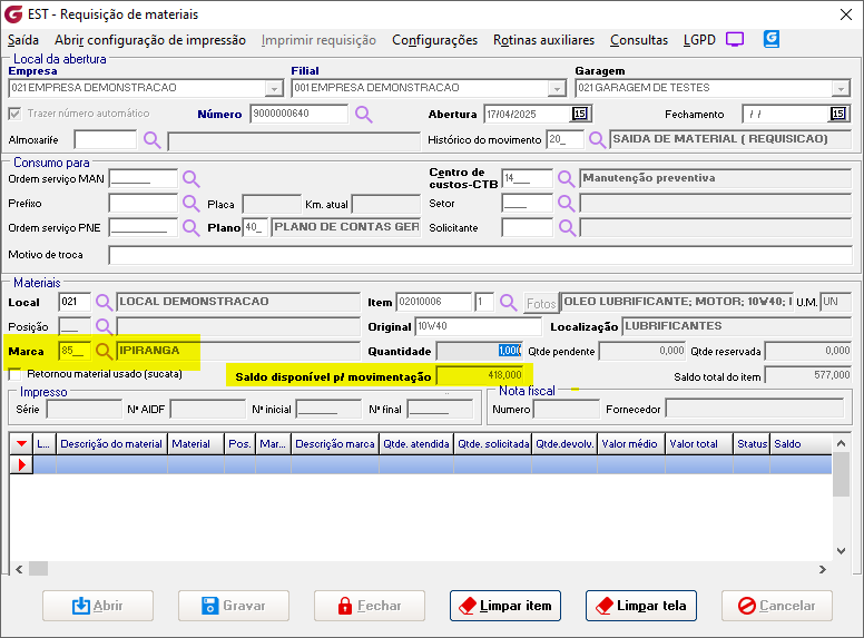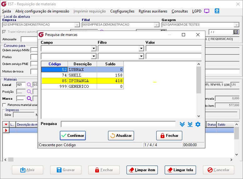 Na requisição acima, a marca 85 foi gravada automaticamente, conforme lista abaixo.
