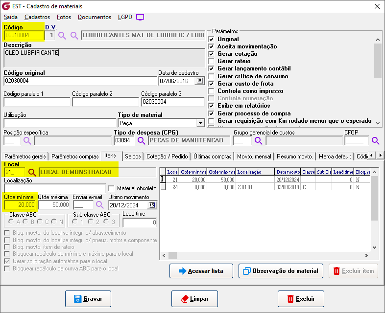 No cadastro do material está informado para o local 21 a quantidade mínima de 20.