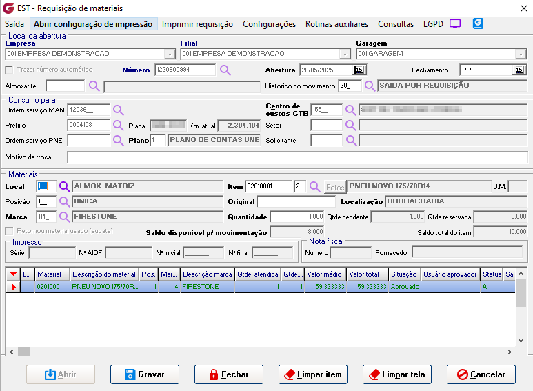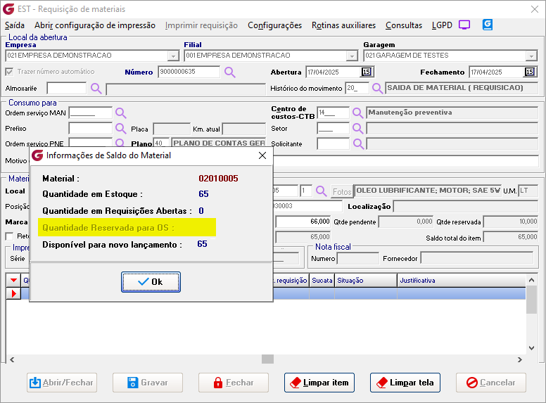 Permitir informar ordem de serviço de pneu Objetivo: Habilitar campo para pesquisa e associação de ordem de serviço de envio de pneu. Consistir quantidade reservada do saldo na abertura da requisição Objetivo: Consistir quantidade reservada na composição do saldo na abertura da requisição A opção é habilitada quando a opção "Baixar requisição no momento da abertura" estiver desmarcada. No cadastro do material é possível consultar se há quantidade reservada para o item.