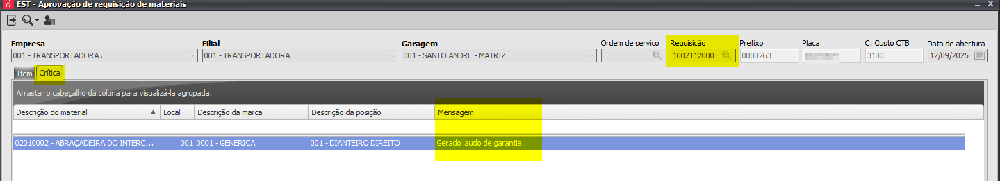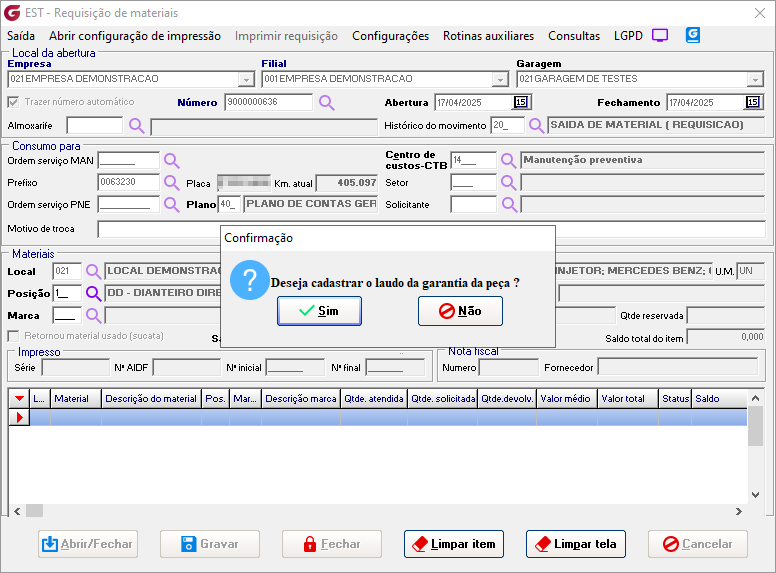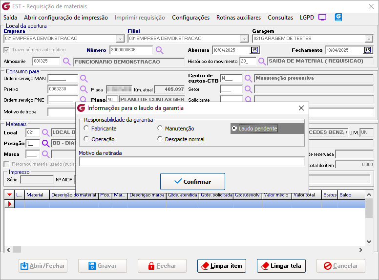 Obrigar a digitação do laudo de garantia Objetivo: O laudo de garantia deve ser preenchido no momento de sua geração. Com o parâmetro marcado, na rotina de requisição de materiais, ao informaR o material que está em garantia, é apresentada tela para marcar a responsabilidade da garantia e o motivo da retirada, o preenchimento não é obrigatório, o laudo é gerado