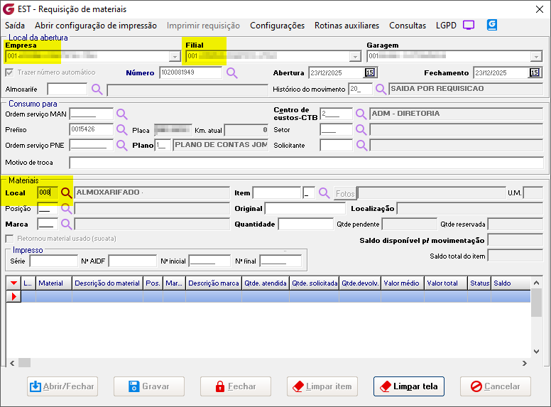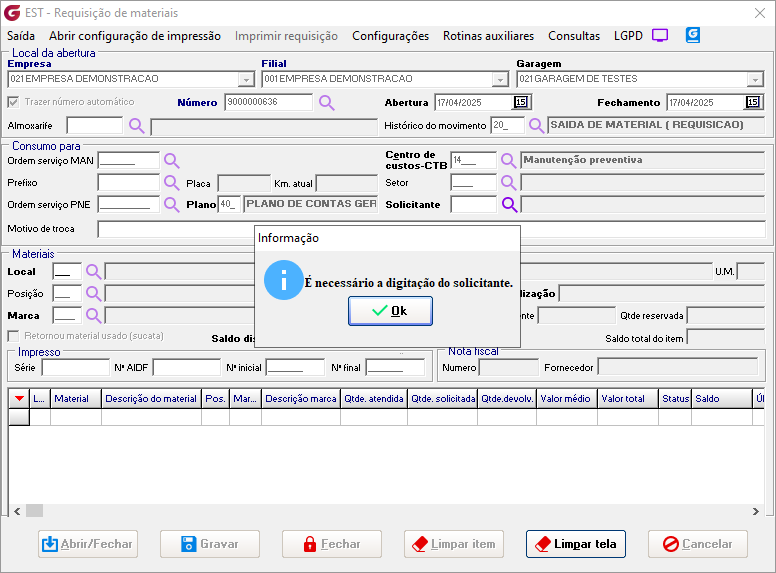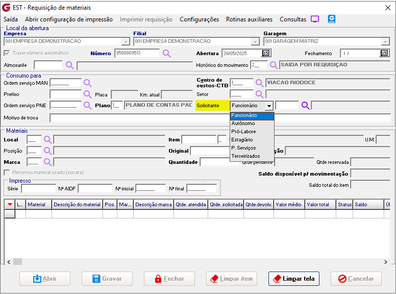 Nas telas de requisição de materiais, ao sair do campo solicitante, o campo local é preenchido automaticamente.
