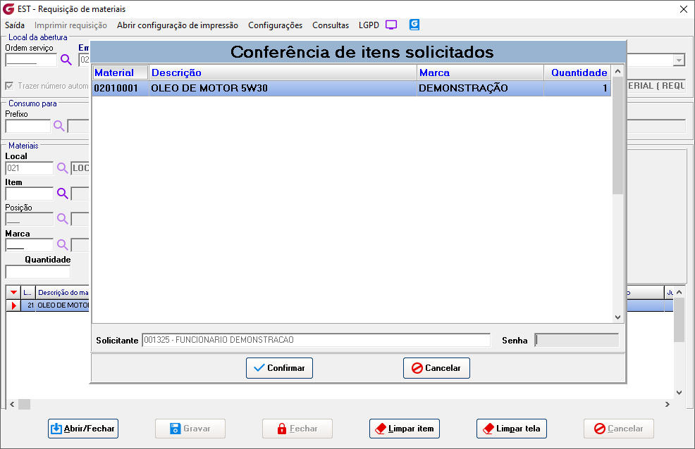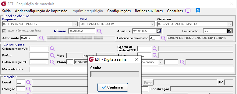 Solicitar senha do almoxarife Objetivo: Solicitar confirmação do almoxarife por senha Para validação de senha o funcionário informado deve estar associado a um usuário no módulo Controle