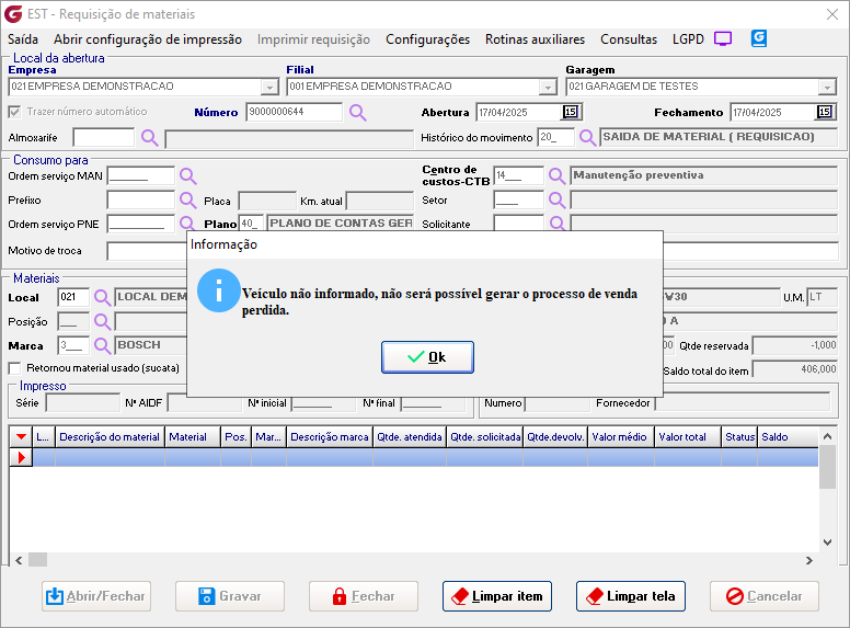Gerar venda perdida Objetivo: Registrar requisições de itens não atendidos por falta de saldo. Implementado o parâmetro “Gerar venda perdida”, com o parâmetro marcado, os itens requisitados sem saldo disponível são registrados para consulta e acompanhamento futuro. Implementado o parâmetro “Consistir se existe veículo para geração da venda perdida”, com o parâmetro marcado, não é gerada venda perdida se não houver veículo informado na requisição. Implementada rotina para só gravar o número da requisição de materiais na venda perdida quando esta requisição realmente for efetivada por algum outro material que tenha saldo. Parâmetros>Estoque>Requisição de materiais Criados os parâmetros “Gerar venda perdida” e “Consistir se existe veículo para geração da venda perdida”.