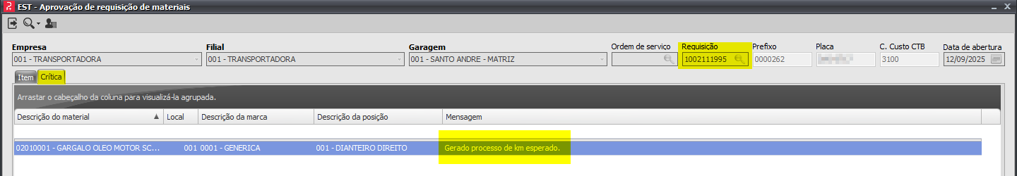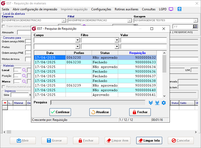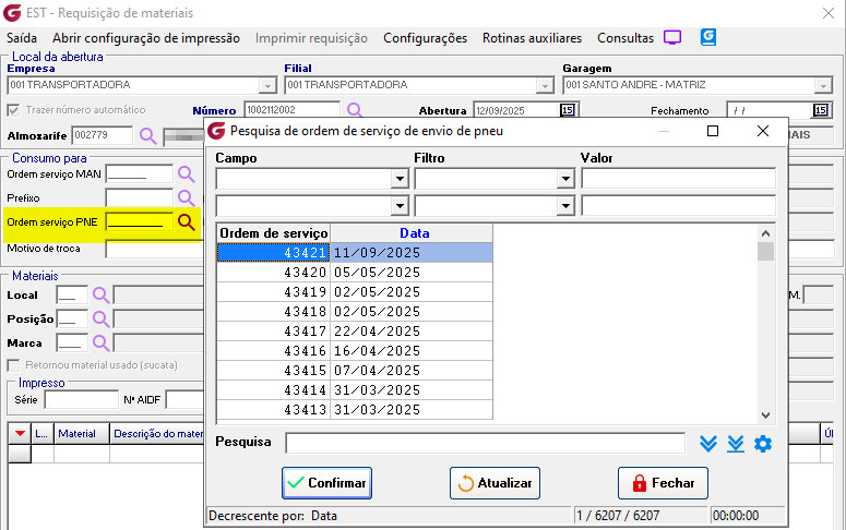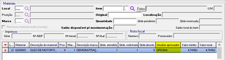 Na rotina "Diários>Saidas>Aprovação de requisição de materiais", consulte as requisições pendentes de aprovação , através do número de requisição ou, se preferir, pelo número da ordem de serviço e selecione a que deseja aprovar.