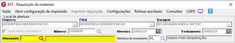 Caminho de acesso: Módulo (EST) >Parâmetros> Estoque> Requisição de materiais |