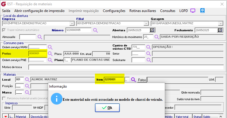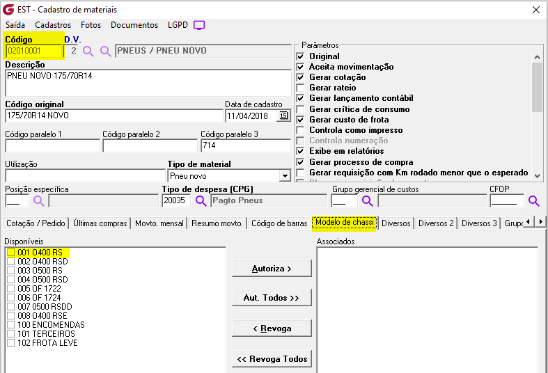 Permitir somente materiais assoc. ao mod. chassi e/ou grupo de serviço Objetivo: Definir quais itens podem ser requisitados de acordo com modelo de chassi do veículo ou quando informada O.S., quais itens pode ser requisitados de acordo com grupos de serviços contidos na O.S. Com o parâmetro marcado serão permitidos apenas itens associados ao modelo de chassi do veículo informado.