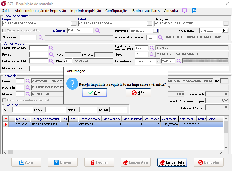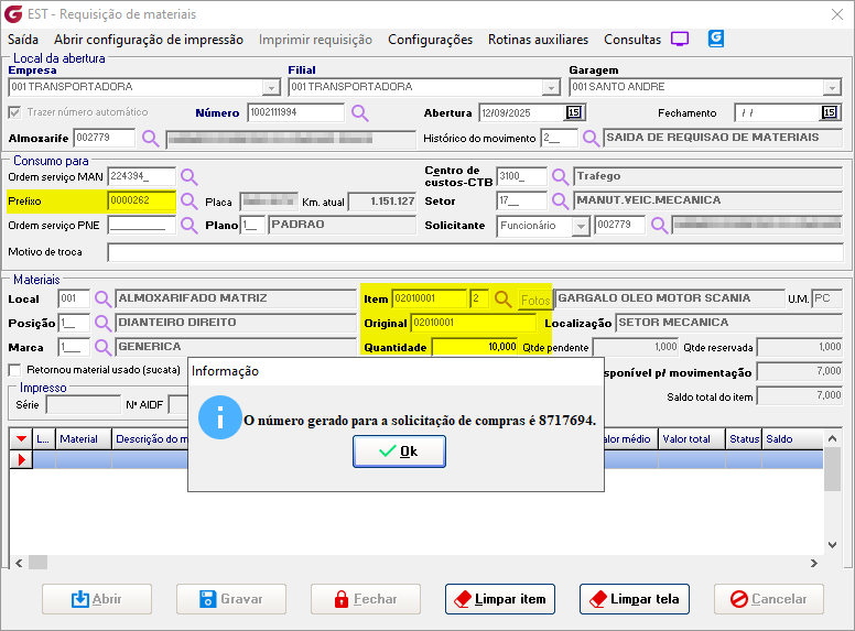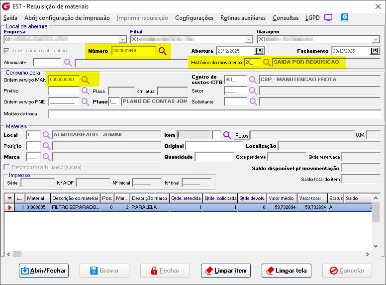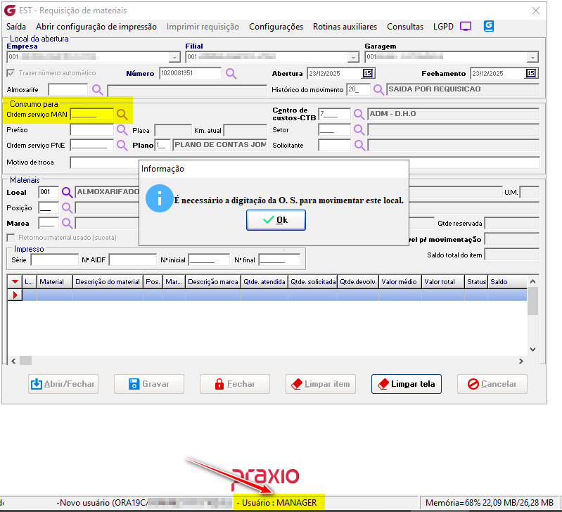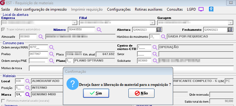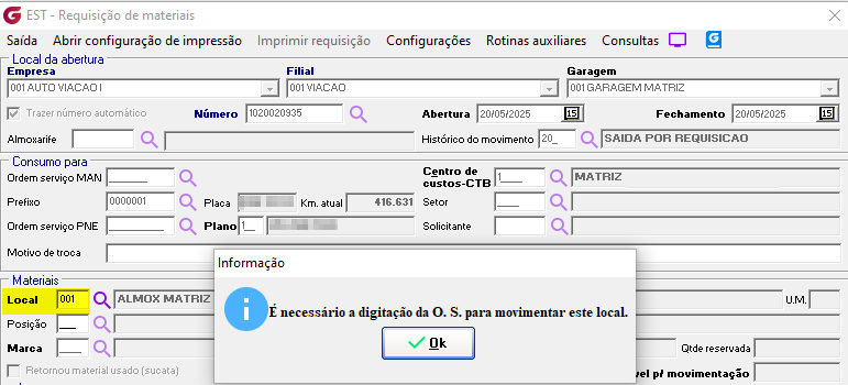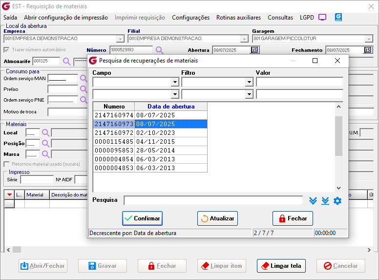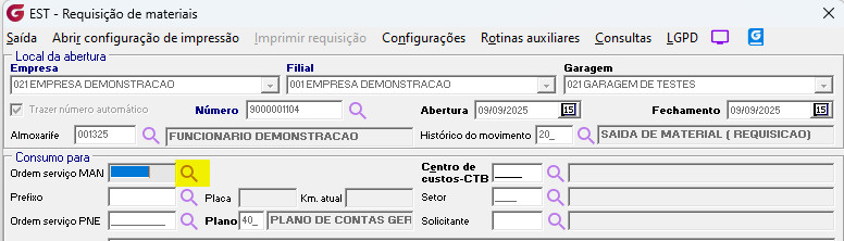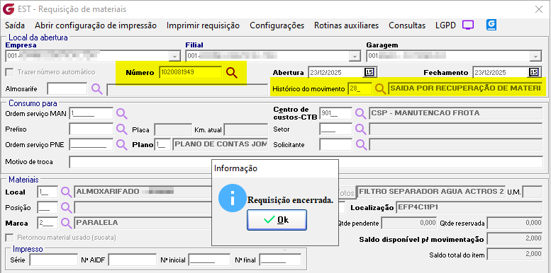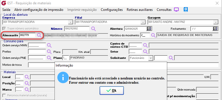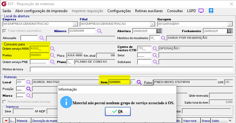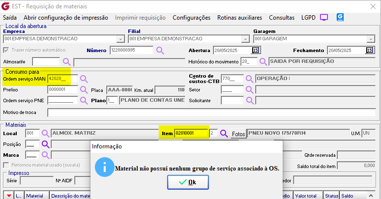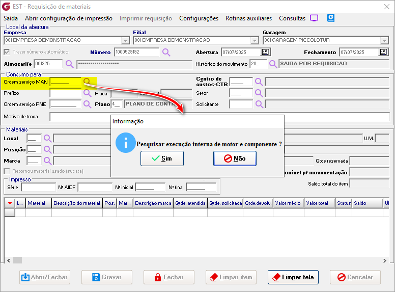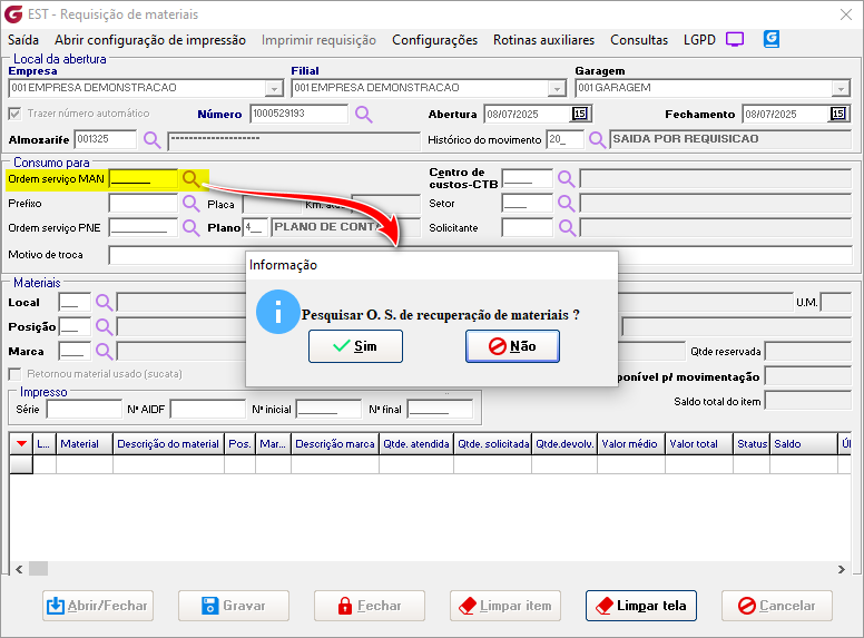 Nas rotinas de requisição, ao associar um ordem de serviço de recuperação de materiais,