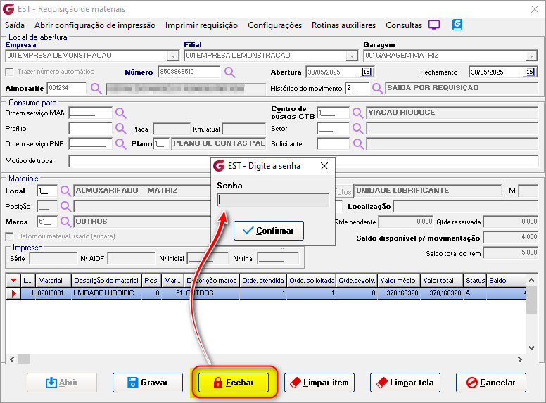 Solicitar senha do almoxarife no fechamento da requisição Objetivo: Definir a obrigatoriedade de senha do almoxarife no momento de fechamento da requisição de materiais. O parâmetro é habilitado apenas quando o parâmetro "Solicitar senha do almoxarife" estiver marcado. Com o parâmetro marcado é obrigatória a digitação de senha do almoxarife ao fechar a requisição.
