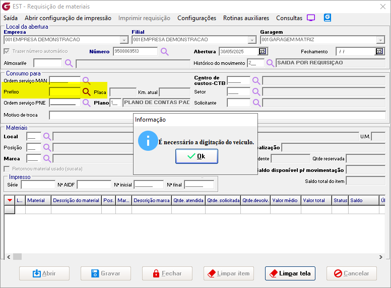 Obrigar a digitação do prefixo na requisição Objetivo: Definir a obrigatoriedade de digitação de prefixo na requisição de materiais. Com o parâmetro marcado é obrigatória a digitação de um prefixo.