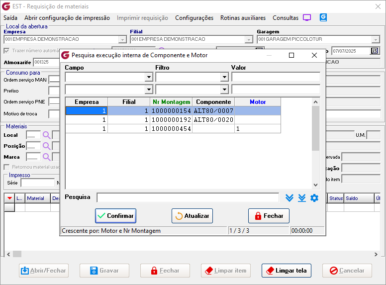 Permitir associar O.S. de motor e componente Objetivo: Permitir associar execução de motor e de compentes nas rotinas de requisição de material Com o parâmetro marcado, ao pesquisar O.S. é apresentada opção para pesquisar execução de motor e componente. Não é possivel digitar o número da execução no campo, a execução só é associada através de pesquisa.