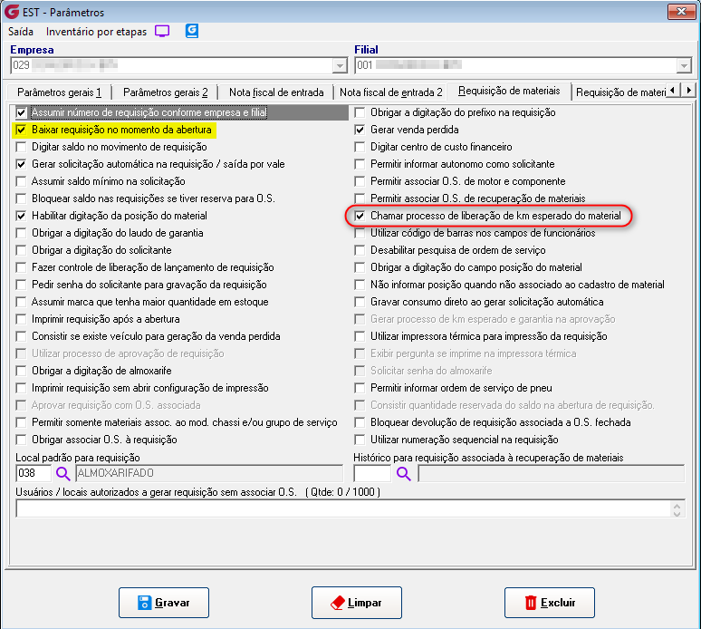 Com o parâmetro marcado no cadastro do local, apenas usuários autorizados podem gerar requisições de materiais sem associação a uma ordem de serviços.