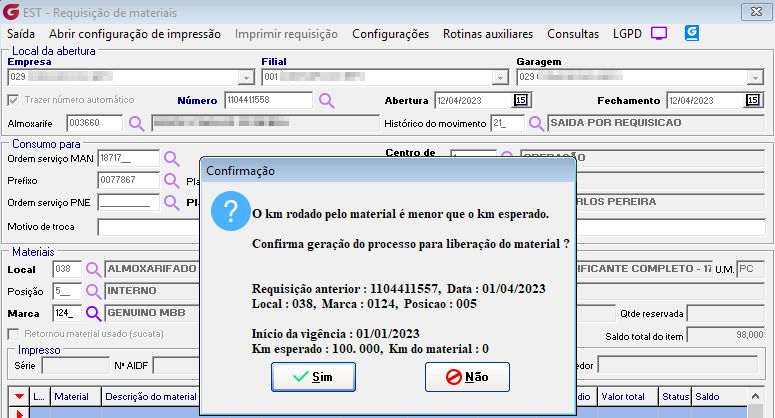 Permitir associar O.S. de recuperação de materiais Objetivo: Permitir associar recuperação de materiais nas rotinas de requisição de material Com o parâmetro marcado, ao pesquisar O.S. é apresentada opção para pesquisar O.S. de recuperação de material. Respondendo sim, é apresentada tela com O.S. de recuperação de materiais Chamar processo de liberação de km esperado do material Objetivo: Solicitar confirmação para liberação do processo nas rotinas de requisição. Com o parâmetro marcado, ao requisitar um item com km abaixo do esperado, após a confirmação de geração do processo, é aberta tela solicitando confirmação para liberação do processo, clicando sim , é solicitado o usuário e senha e em seguida aberta a tela para liberação do material.