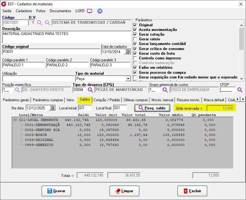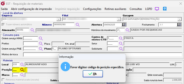 Com o parâmetro desmarcado, o saldo reservado não é considerado na validação. Habilitar digitação da posição do material Objetivo: Possibilitar a digitação de posição nas rotinas de requisição de materiais. Com o parâmetro marcado é habilitado campo para pesquisar e informar posição de retirada do material. Com o parâmetro desmarcado, o campo fica desabilitado para movimentação.