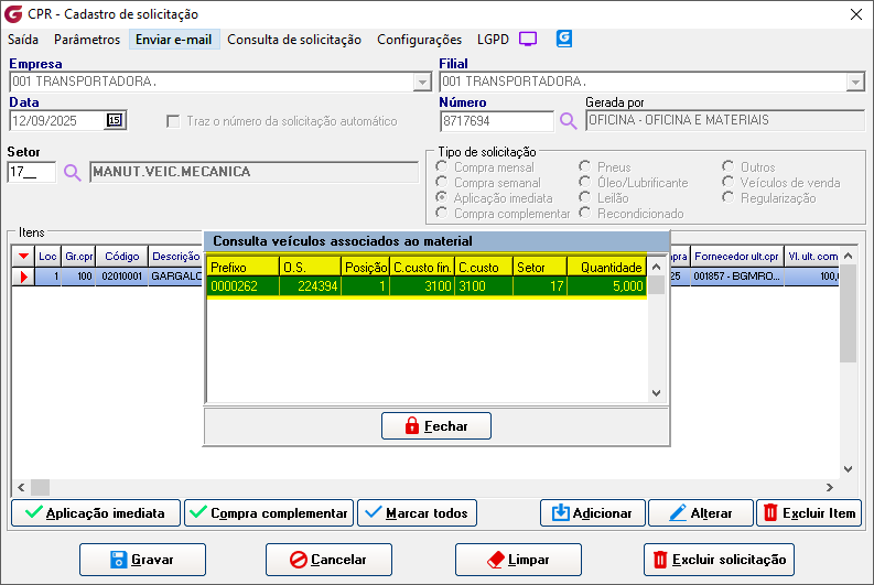Criada tela para consulta de venda perdida, nessa tela é possível acompanhar o “status” de cada venda perdida gerada, é possível também excluí-las. Quando o item é adquirido e requisitado ao veículo, a requisição é associada à venda perdida, “fechando” a pendência. Não é permitida a exclusão de venda perdida fechada.