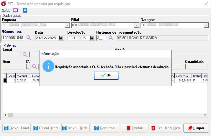 Bloquear devolução de requisição associada a ordem de serviço fechada Objetivo: Não permitir devolução de requisição que esteja associada a O.S. fechada Com o parâmetro marcado, na rotina de devolução de saída, não é permitida a devolução se houver associação a ordem de serviço fechada.