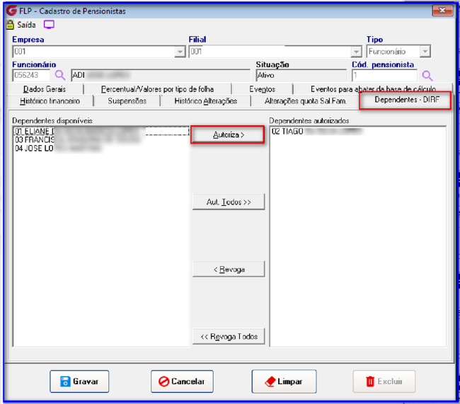 O dependente que estiver associado na Aba Dependentes DIRF, terá que ter cadastrado o CPF no cadastrado de dependentes (Acesse o menu Cadastros > Funcionários > Dependentes)
