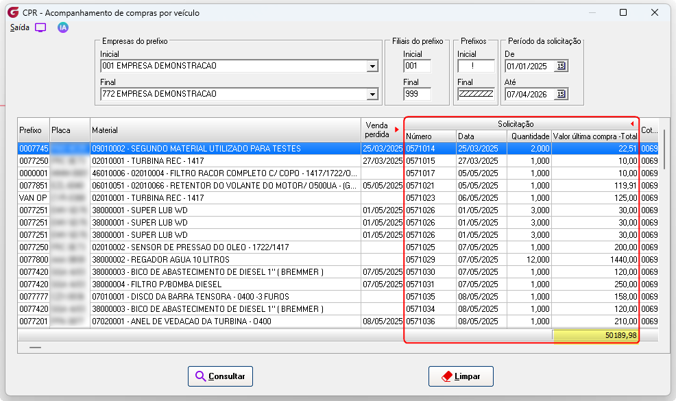 Solicitação - São apresentadas na consulta, as solicitações de compras com veículos associados Número - Número da solicitação Data - Data da solicitação Quantidade - Quantidade do item solicitado Valor última compras - Total - Valor total do item de acordo com a última compra, campo possui um totalizador
