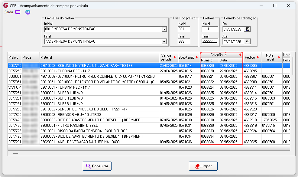 Cotação - São apresentadas na consulta, as cotações geradas a partir das solicitações de compras com veículos associados Número - Número da cotação gerada Data - Data da geração da cotação