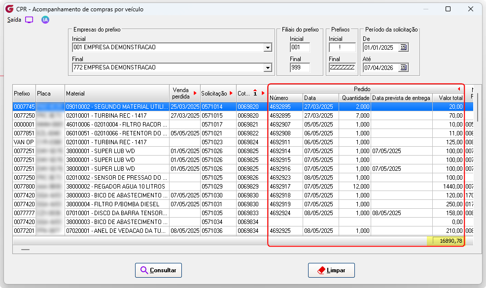 Pedido - São apresentados na consulta, os pedidos gerados a partir das solicitações de compras com veículos associados Número - Número do pedido do item Data - Data da geração do pedido Quantidade - Quantidade do item no pedido Data prevista de entrega - Data prevista do item informada no pedido de compras Valor Total - Valor total do item