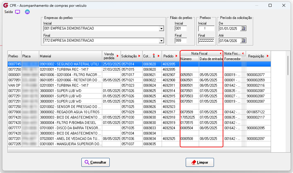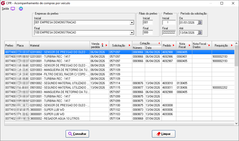 Caminho de acesso: >Consultas> Acompanhamento de compras por veículo. |