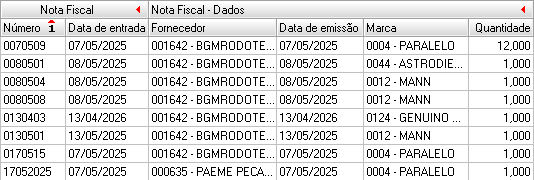 Nota fiscal - Dados Fornecedor - Código e descrição do fornecedor Data de emissão - Data de emissão da nota fiscal Marca - Marca do material Quantidade - Quantidade recebida do material