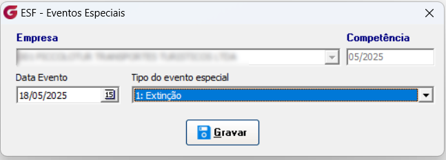 Será aberta a tela abaixo na qual o usuário deverá inserir a Data Evento e Tipo do Evento Especial e Gravar;