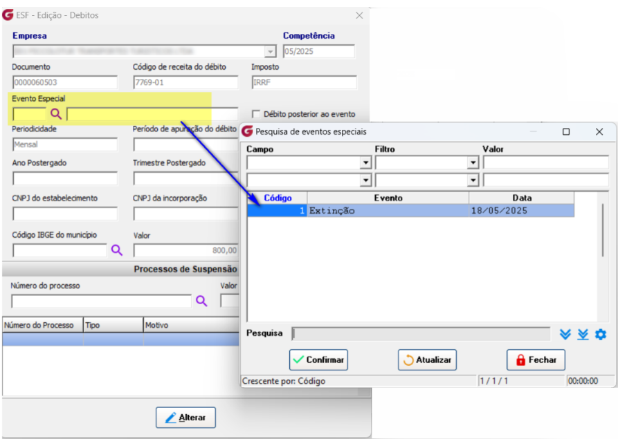Abrirá a tela abaixo, no campo Evento especial clicando na lupa é possível visualziar todo os eventos especiais cadastrados, selecione o desejado.