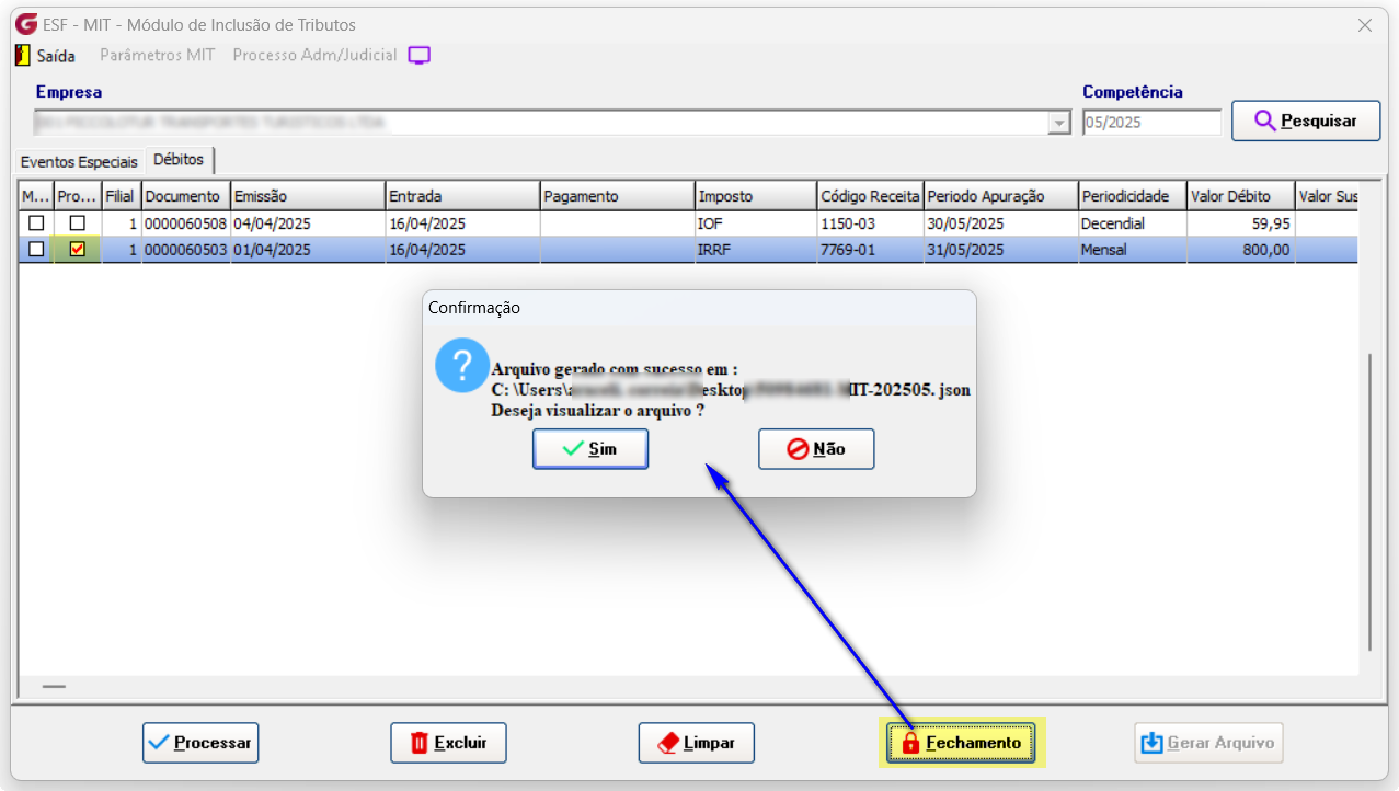 Processe o Tributo, clique em fechamento e automaticamente o arquivo será gerado. O mesmo deverá ser importado no MIT.