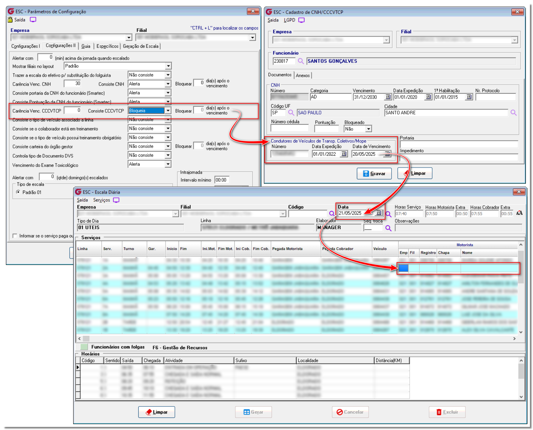 1. Descrição da Regra Desenvolvida. A Regra do vencimento do CCCVTCP, permiti escalar o funcionário até a data de seu vencimento, respeitando a parametrização da quantidade de X dias após essa data, caso houver. Desta forma o usuário poderá usar o dia do vencimento como data base para o funcionário ser bloqueado no sistema. 1.1. Processo de Habilitação do Parâmetro. Na data registrada do vencimento do CCCVTCP o sistema NÃO Bloquear a escala do funcionário, Trocas e Substituições deste funcionário também não sofreram interferência nesta data, mesmo com o documento vencido na data e independente do parâmetro que estiver Ativo na Tela de Parâmetros do Sistema no Acesso: Utilitário> Parâmetros de Configuração do Sistema> Aba Configuração II, quando gerado escala para um funcionário que esteja nesta condição, na Tela da Escala Diária será apresentado a mensagem “Motorista c/ CCCVTCP vencida ou a vencer” que alerta o usuário quanto ao vencimento, figura 1.