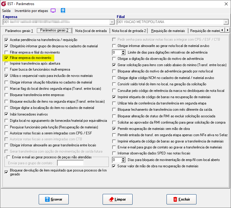 | Implementado parâmetro "Filtrar empresa do movimento" . Com esse parâmetro marcado, são exibidos todos os prefixos da empresa do movimento, independente da filial. O parâmetro é alternativo ao parâmetro "Filtrar empresa e filal do movimento", a utilização de um desabilita a utilização do outro.
