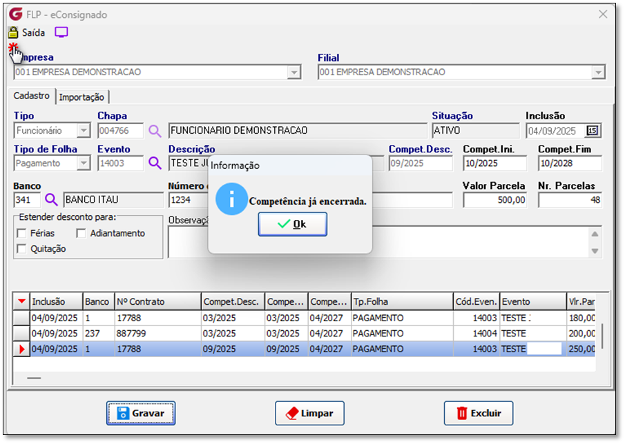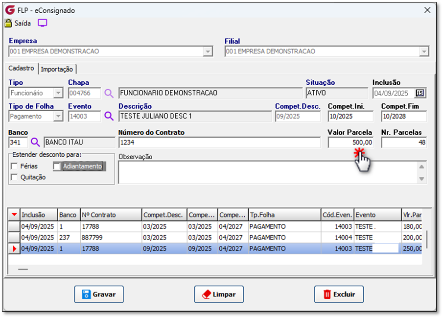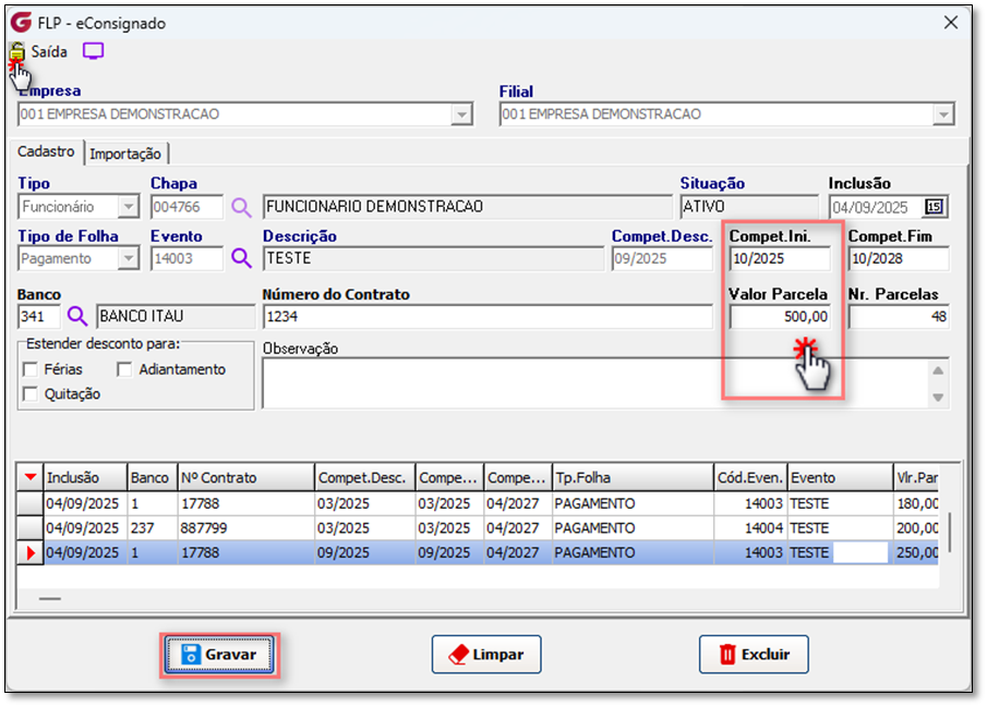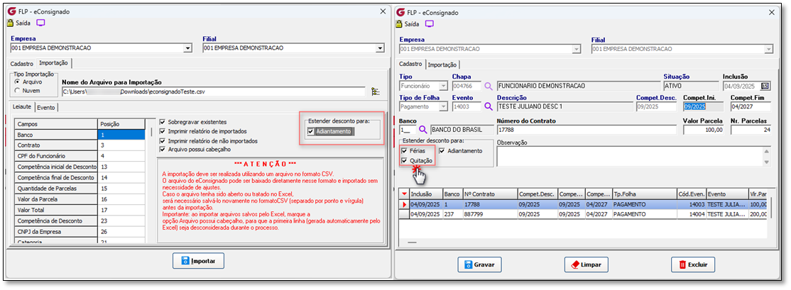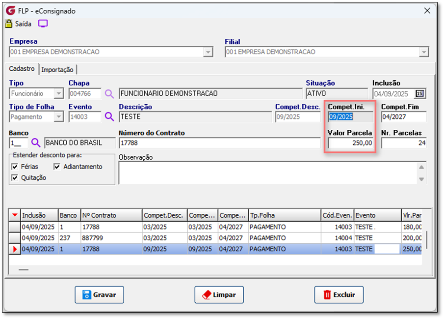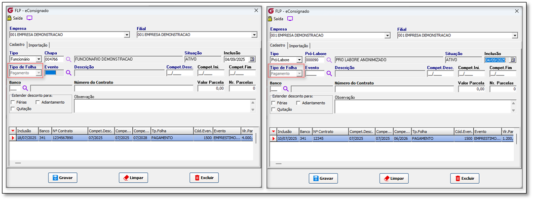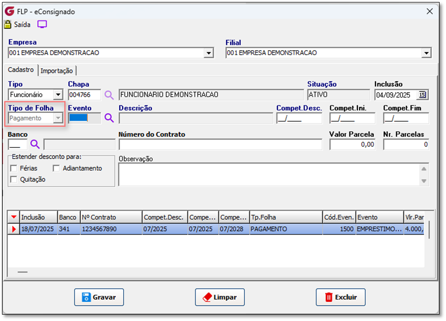 * Local do Menu: FLP > Procedimentos Mensais > eConsignado > Crédito do Trabalhador.