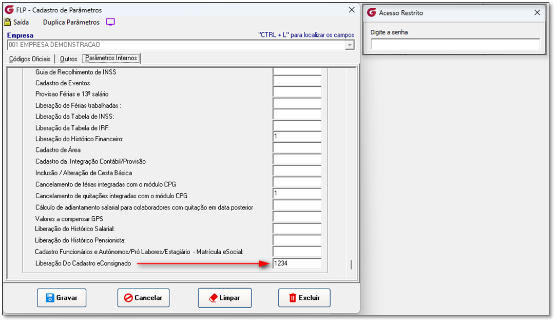 FLP – Procedimentos Mensais – eConsignado – Crédito do Trabalhador FLP – Cadastros – Cadastros Auxiliares – Parâmetros Gerais – Parâmetros Internos |