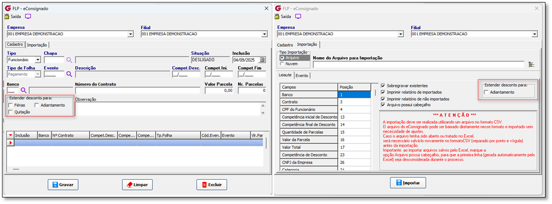 3. Opção de Estender Desconto para Adiantamento: Nova opção na aba de importação para definir se o desconto se aplica ao adiantamento.