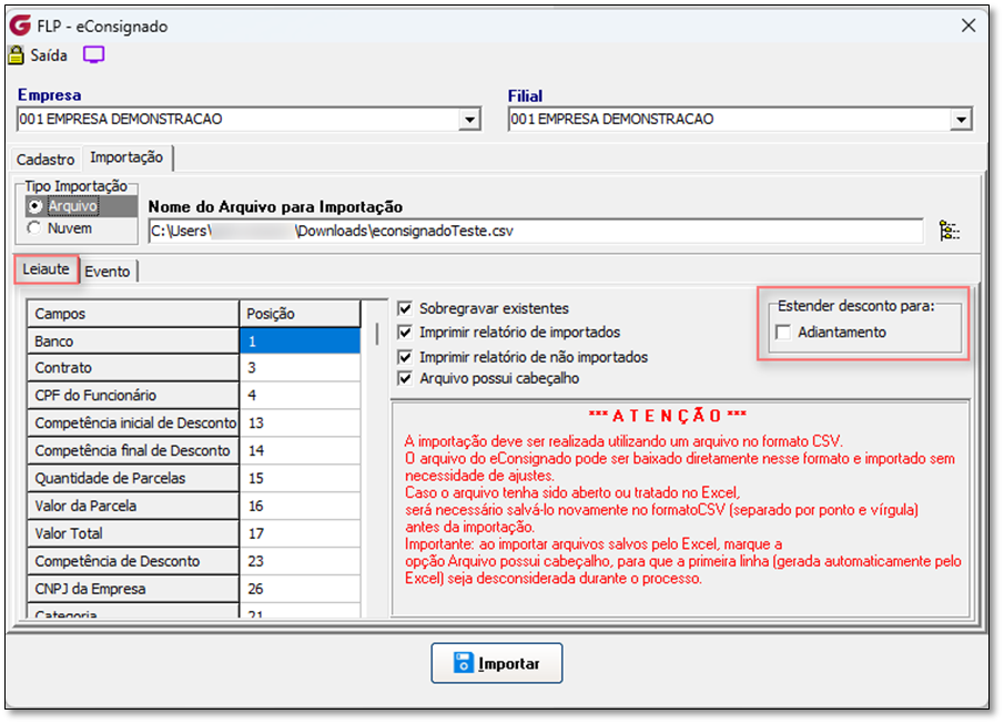 * Ação: Marcar "Estender desconto para adiantamento" e confirmar a importação.