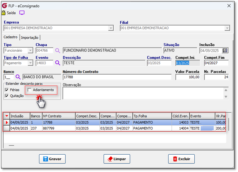 * Resultado: Sistema deve gravar "N" no campo "Desconta_Adiantamento".