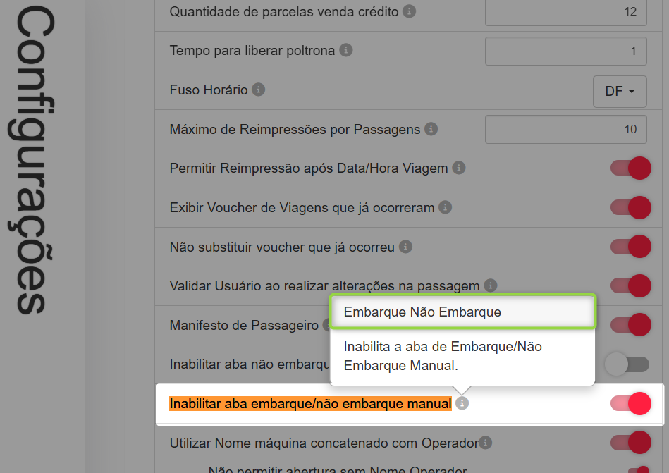 Menu superor Lateral: ➪ Configurações > Inabilitar aba embarque/não embarque manual |
