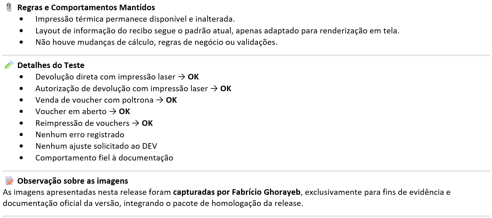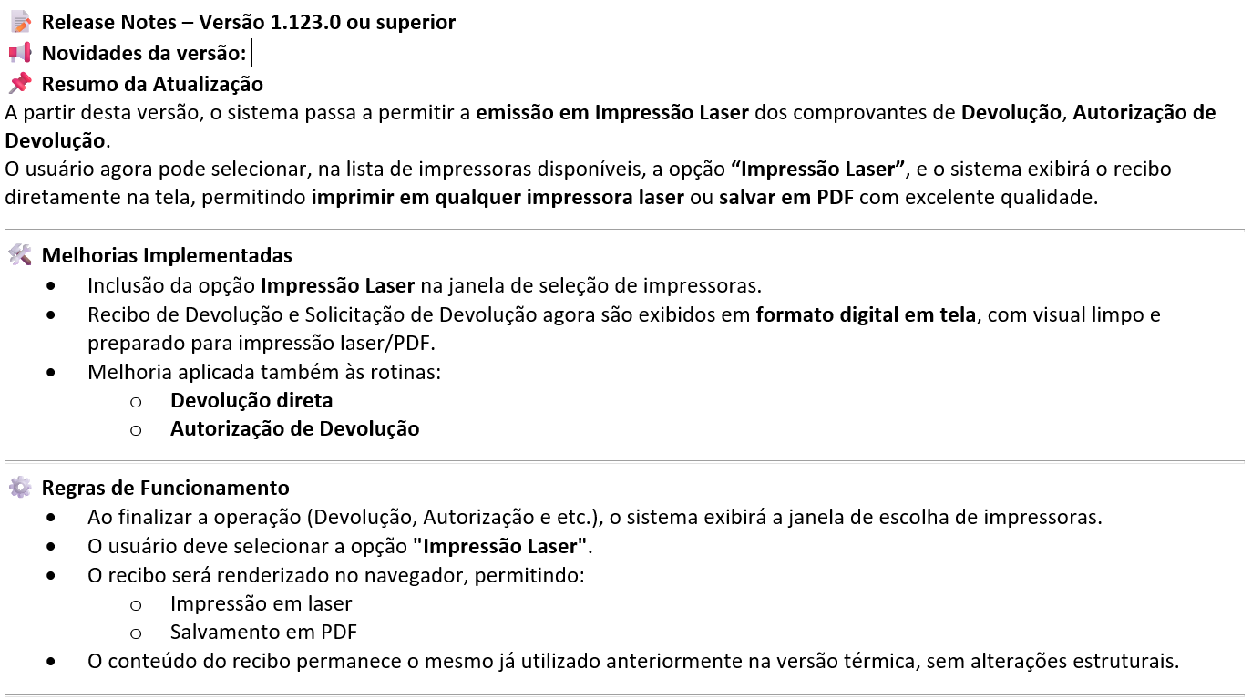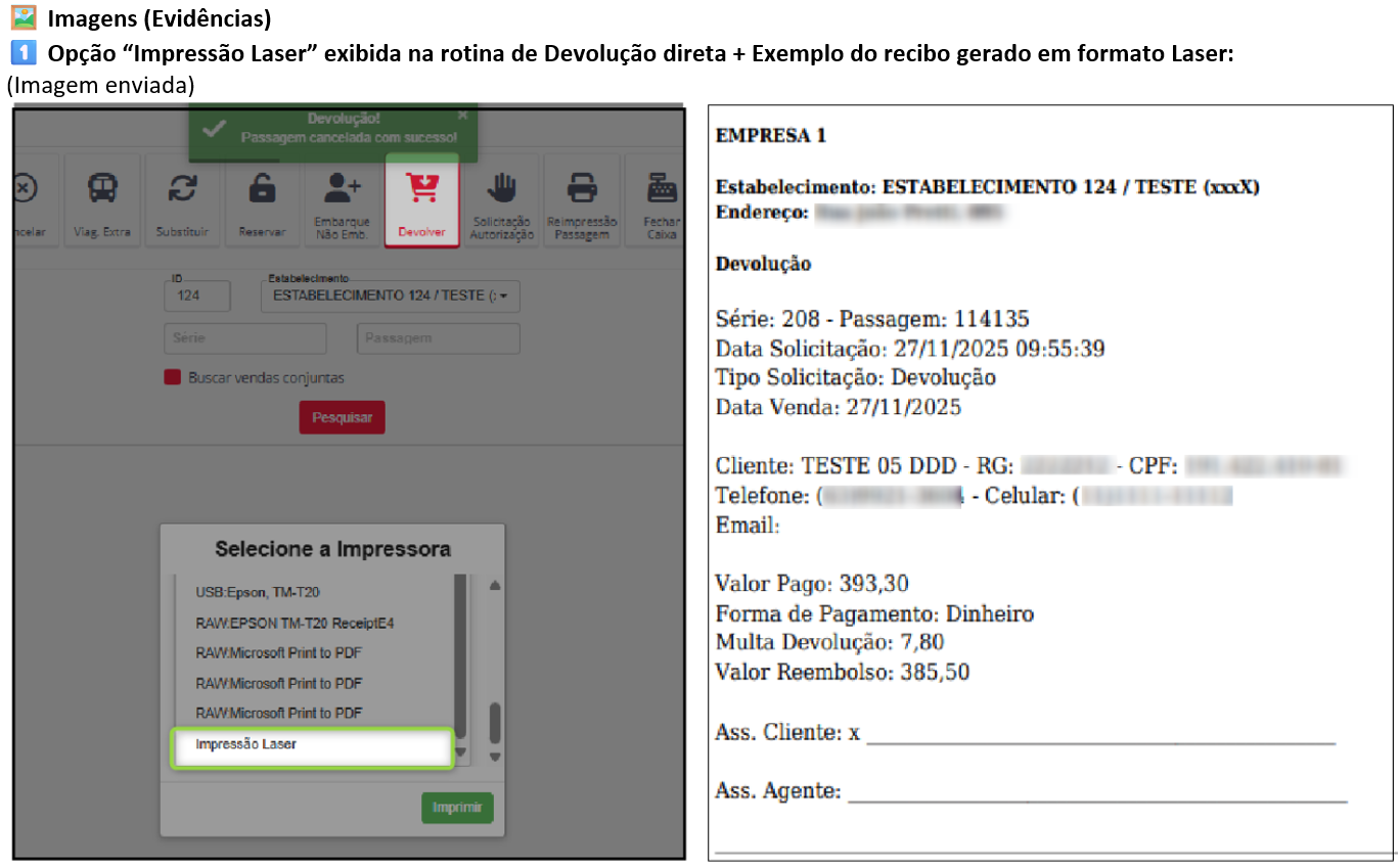Disponibilização da Impressão Laser para Recibos de Devolução e Solicitação de Devolução. |