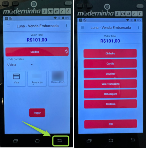 Habilitação do botão “Voltar” na tela de pagamento do dispositivo PagSeguro. |