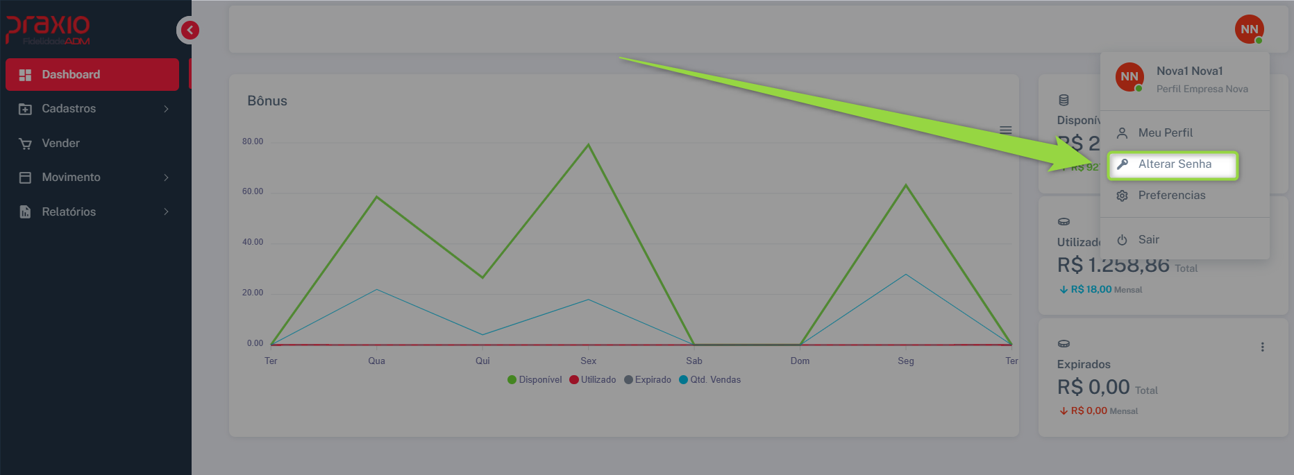 Módulo: Praxio Fidelidade ADM Versão: Nº Ticket: 0925-003397. Solicitação: Não informado. Task: 555724. Caminho de acesso: Praxio Fidelidade ADM [Caminho]: Perfil > “Alterar Senha”.