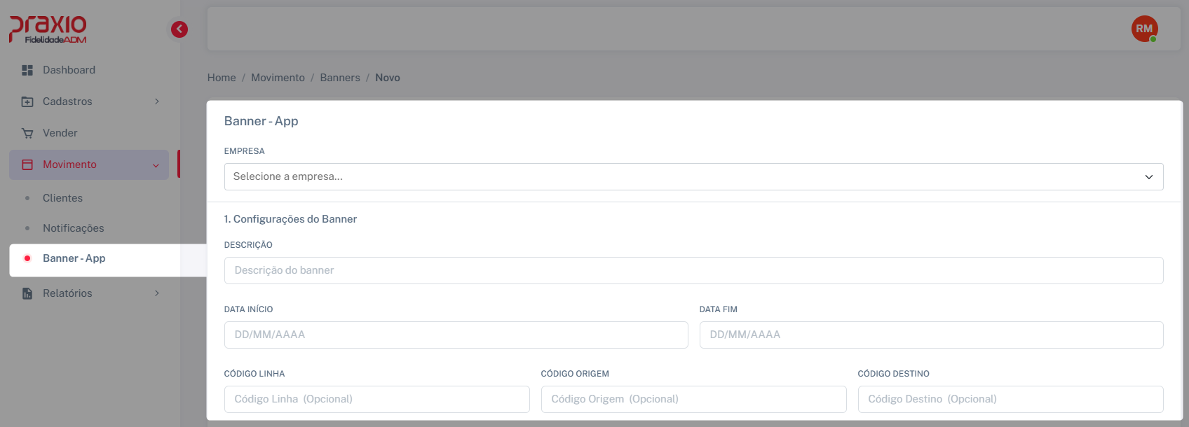 Os banners cadastrados no Portal Web Praxio Fidelidade ADM serão exibidos de forma sequencial no aplicativo Praxio Fidelidade, na página inicial ou na tela de configuração das partidas, permitindo a navegação entre eles ao pressionar a imagem e deslizar para a esquerda ou direita. Os banners que possuírem trechos configurados no portal ADM terão esses trechos carregados automaticamente ao clicar na imagem correspondente.