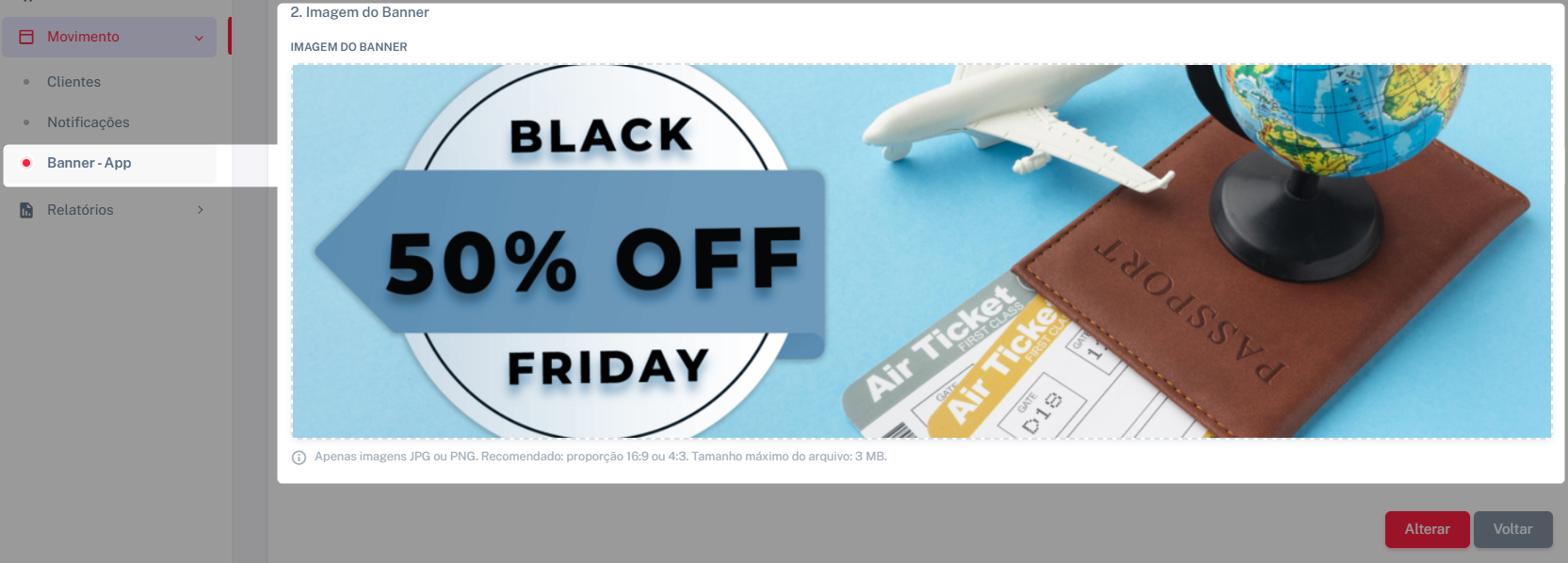 Após a configuração dos parâmetros, basta arrastar ou soltar a imagem no campo disponibilizado para anexo. O sistema aceita apenas imagens nos formatos JPG ou PNG, sendo recomendadas as proporções 16:9 ou 4:3, com tamanho máximo de 3 MB. Figura 03 - Imagem ilustrativa do campo destinado à seleção da imagem que será exibida no aplicativo com um exemplo de imagem cadastrado. São permitidas apenas imagens nos formatos JPG ou PNG para cadastro na rotina, sendo recomendada a utilização das proporções 16:9 ou 4:3, com tamanho máximo de 3 MB por arquivo. Após o cadastro dos banners, o grid principal da rotina é automaticamente atualizado com os registros, exibindo a listagem dos banners cadastrados no sistema e permitindo visualizar, editar ou excluir cada item por meio da coluna Ações. Ressalta-se que o sistema permite a inclusão de no máximo 5 banners para exibição no aplicativo. Figura 04 – Imagem ilustrativa da tela de cadastro de banners com 5 registros cadasrados.