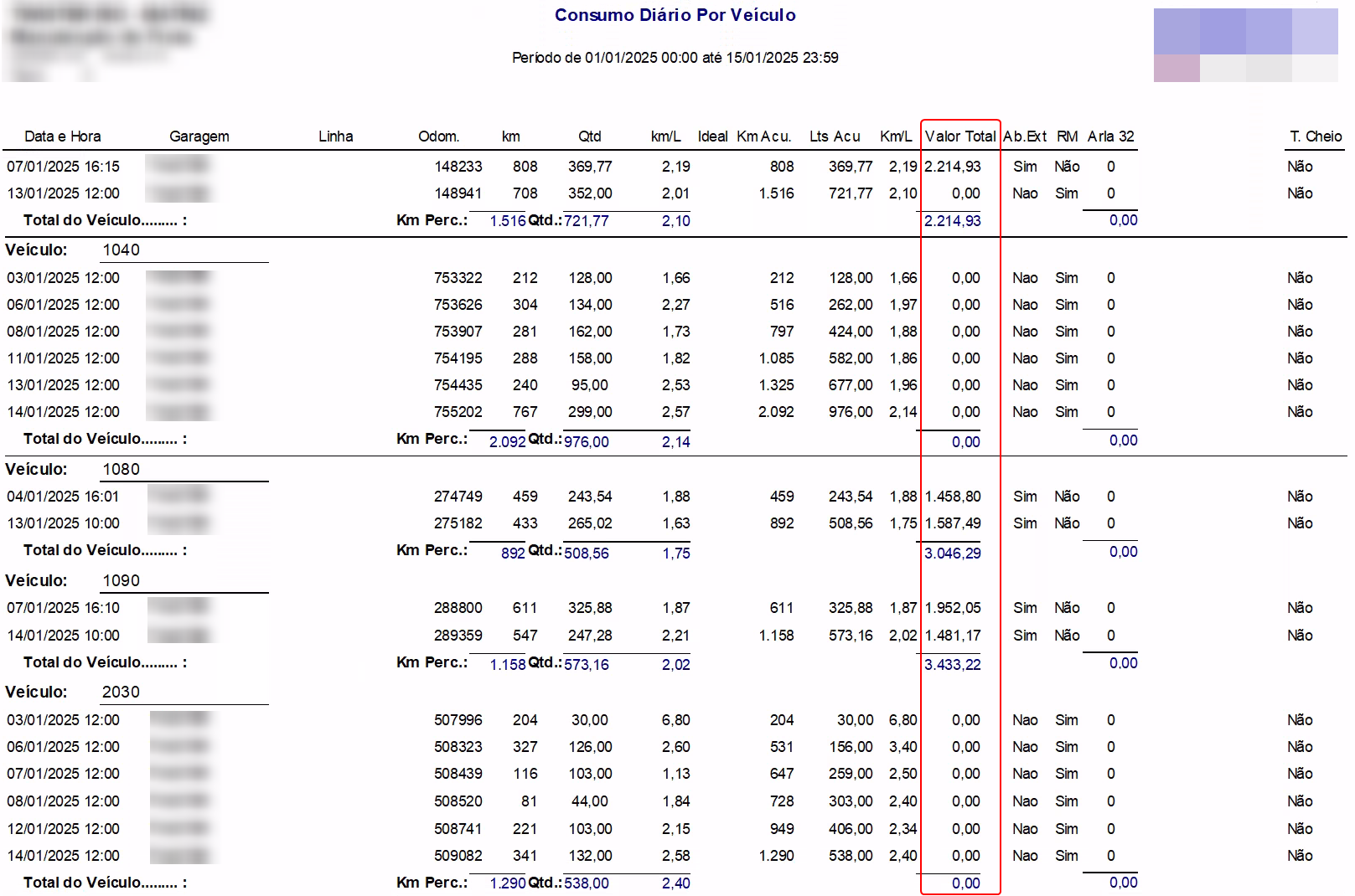 Implementar um totalizador na coluna valor total do relatório consumo diário por veiculo |