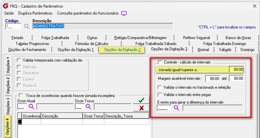 FRQ - Cadastro - Parâmetros – Cadastro - Opções da Digitação 3 – “Controle – cálculo de intervalo”