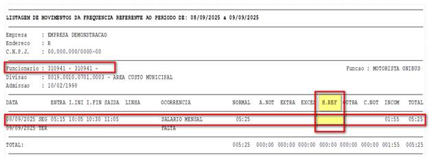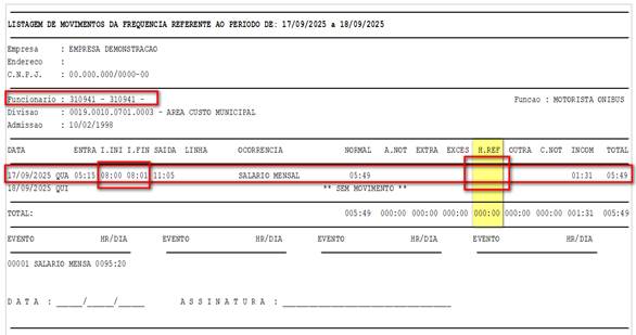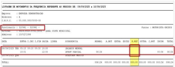 Listagem de Movimento baseada no Modelo 09, agora incluindo a nova coluna "H.REF" (Horas de Refeição), que detalha o valor calculado referente ao intervalo não concedido.