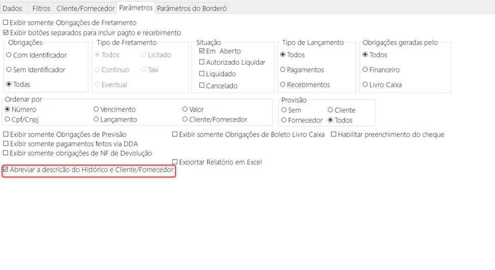 Foi criado parâmetro “Abreviar a descrição do Histórico e Cliente/Fornecedor”, caso habilitado, ao imprimir os registros, as colunas Histórico e Cliente/Fornecedor, caso tenha quebra de linha, somente a primeira linha será exibida, reduzindo a quantidade de páginas do relatório. Imagens meramente ilustrativas: